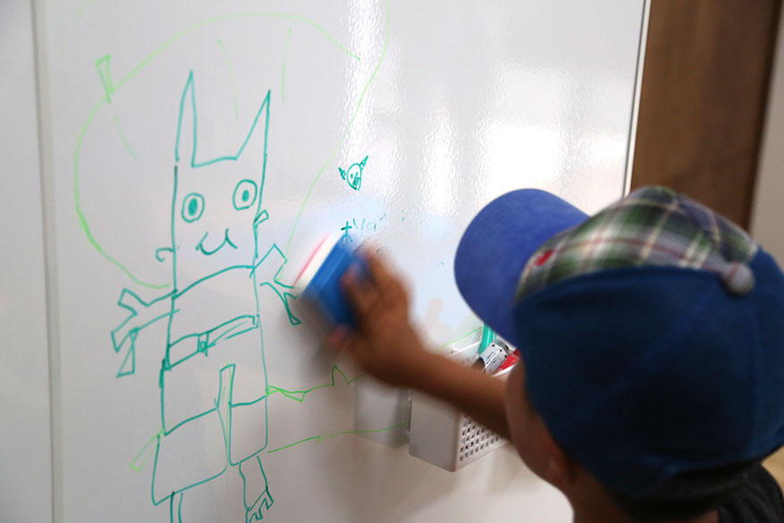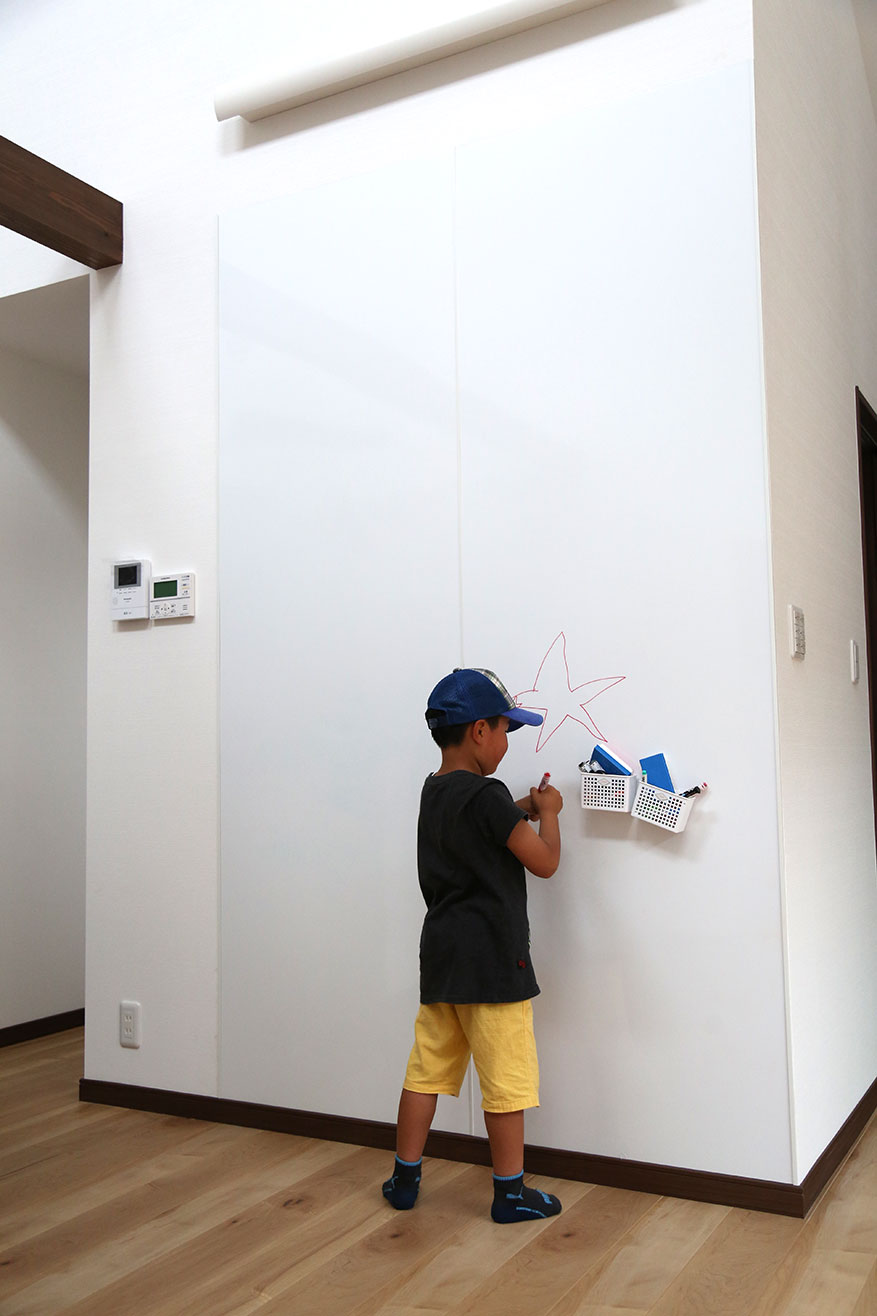 家族の予定や、子供がお絵かきできる壁、書斎スペースをリビングに配置